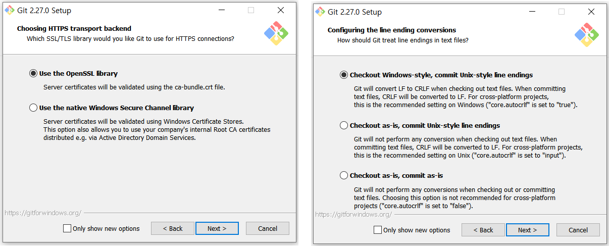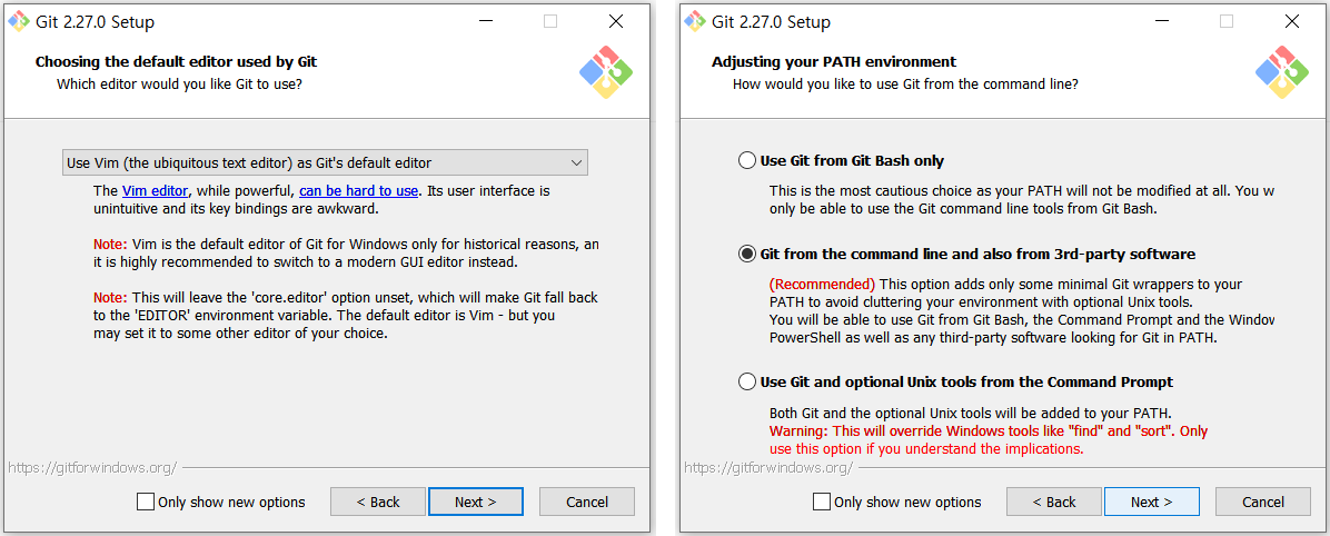 3. 기본 편집기 선택과 커맨드 라인에서 어떤 방법으로 깃을 사용할지 선택하기