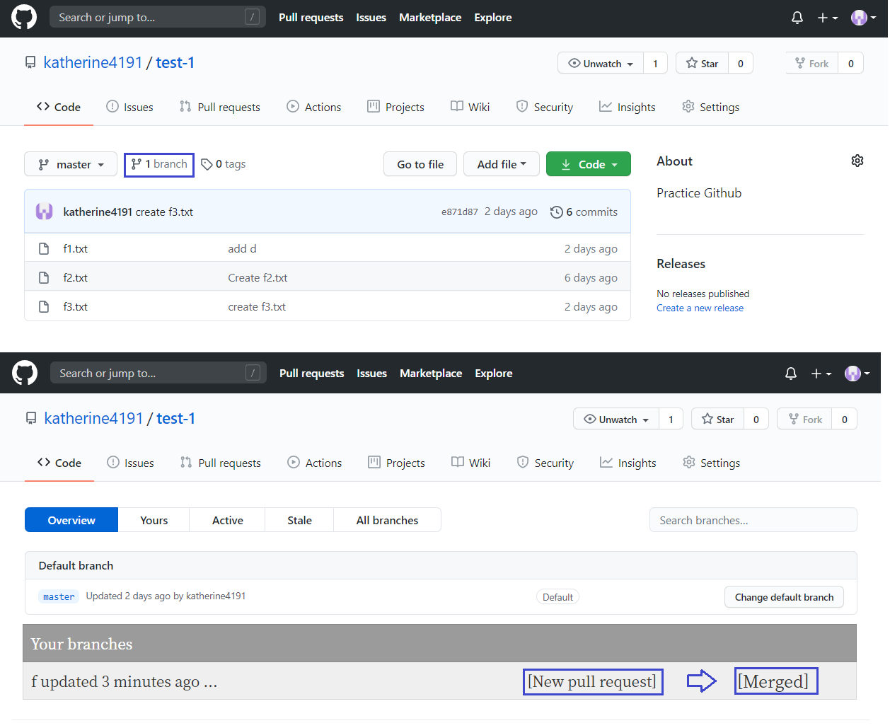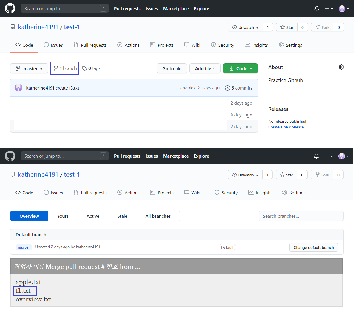 - 아직 원격 저장소의 파일 목록에는 f branch에서 만들었던 f1.txt가 없다.
