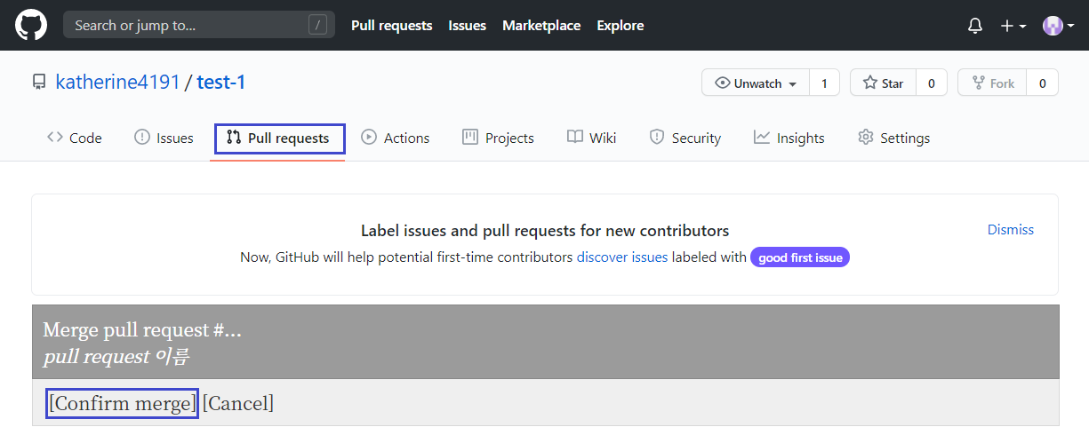 왜냐하면 push한 branch는 pull request를 통해 병합해야 원격 저장소에 반영되기 때문이다.