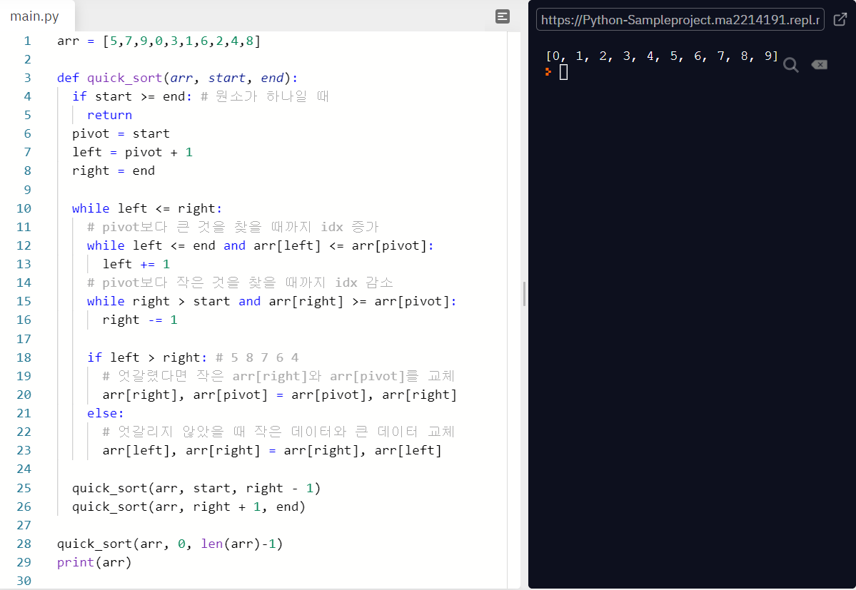 # 엇갈렸다면 작은 arr[right]와 arr[pivot]를 교체
