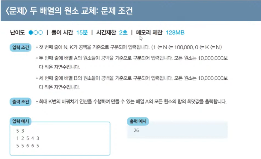 (단, 배열 A에서 가장 작은 원소가 배열 B에 있는 가장 큰 원소보다 작을 때에만 교체를 해야한다)