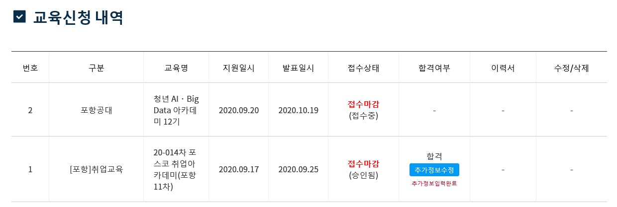 AI,BigData 아카데미를 지원하기 위해서 10월 30일에 끝나는 11차 포스코 취업 아카데미에 지원하였다.