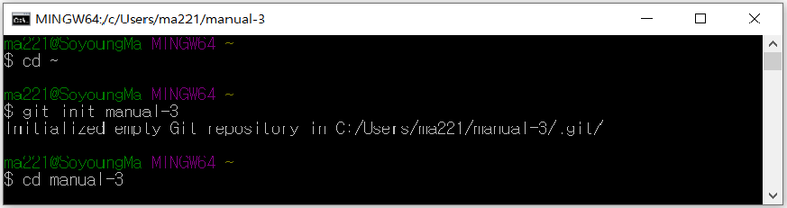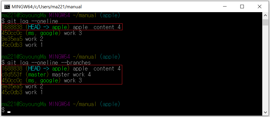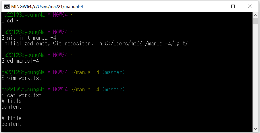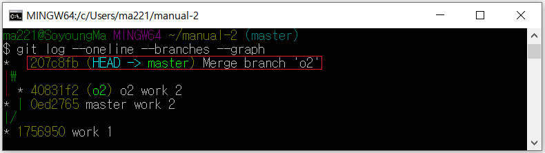 홈 디렉터리로 이동한 후 manual-3 깃 저장소를 생성 및 manual-3 directory로 이동work.txt 생성 및 스테이징, 커밋o2 branch 생성, 따라서 master와 o2 branch에는 모두 work 1 커밋이 존재master branch에서 work.txt 수정 후 커밋하기o2 branch의 work.txt 파일 수정 및 커밋하기master branch로 체크아웃 후 o2 branch를 master branch로 끌어온다 "auto~" : 병합 완료 메시지o2 branch의 수정 내용이 master branch의 수정 내용과 합쳐져 하나의 파일을 생성