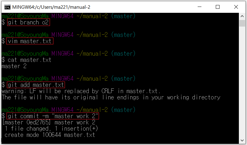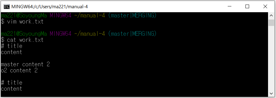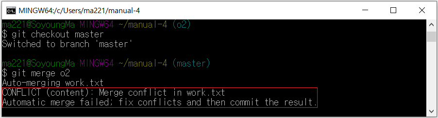 manual-4 깃 저장소 생성 및 work.txt 파일 생성하기work.txt 스테이징 및 "work 1" 커밋o2 branch 생성 및 master branch에서 work.txt 수정, 스테이징, "master work 2" 커밋o2 branch에서 work.txt 수정, 스테이징, "o2 work 2" 커밋자동 병합하는 동안 충돌이 발생