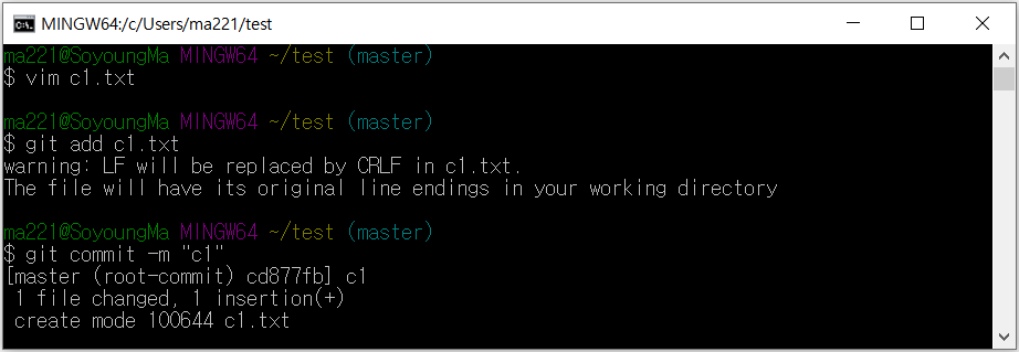 지역 저장소 loc-git(local git)를 만들고 f1.txt 생성, 스테이징, 커밋 (터미널 창 닫지 않기!)