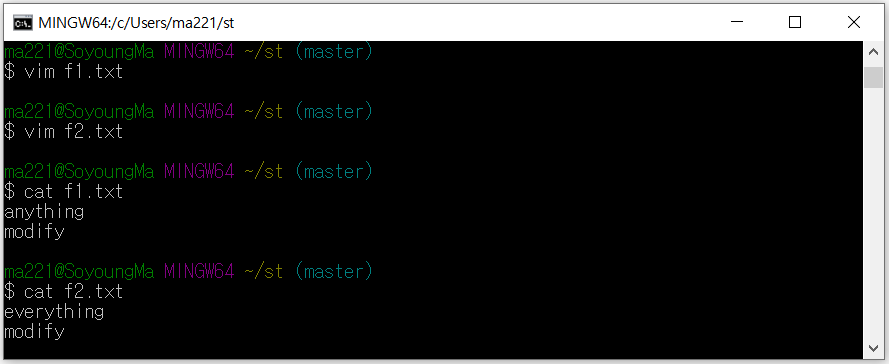 git stash 명령을 사용하려면 tracked(한 번은 커밋한 상태)여야 하므로 f1.txt 생성 및 스테이징, "f1" 커밋f2.txt 파일 생성 및 스테이징, "f2" 커밋f1.txt와 f2.txt 다시 한 번 수정하기