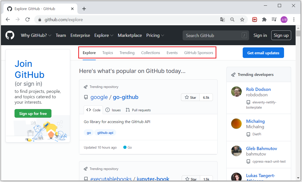 깃허브에 등록된 여러 저장소들을 한눈에 살펴볼 수 있다카테고리마다 인기 있는 저장소들이 분류되어 있으므로 관심 분야의 소스를 찾아 공부할 수 있다.한국어 처리를 위한 소스가 필요하다면 깃허브에서 저렇게 찾으면 된다.