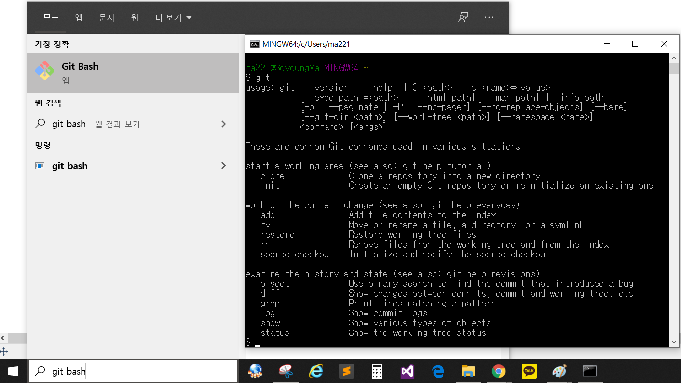 윈도우 작업 표시줄의 검색 창에 git bash 검색 -> 실행 -> git 입력 후 Enter