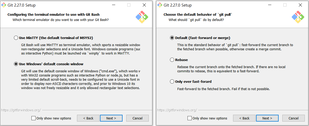 3. 기본 편집기 선택과 커맨드 라인에서 어떤 방법으로 깃을 사용할지 선택하기